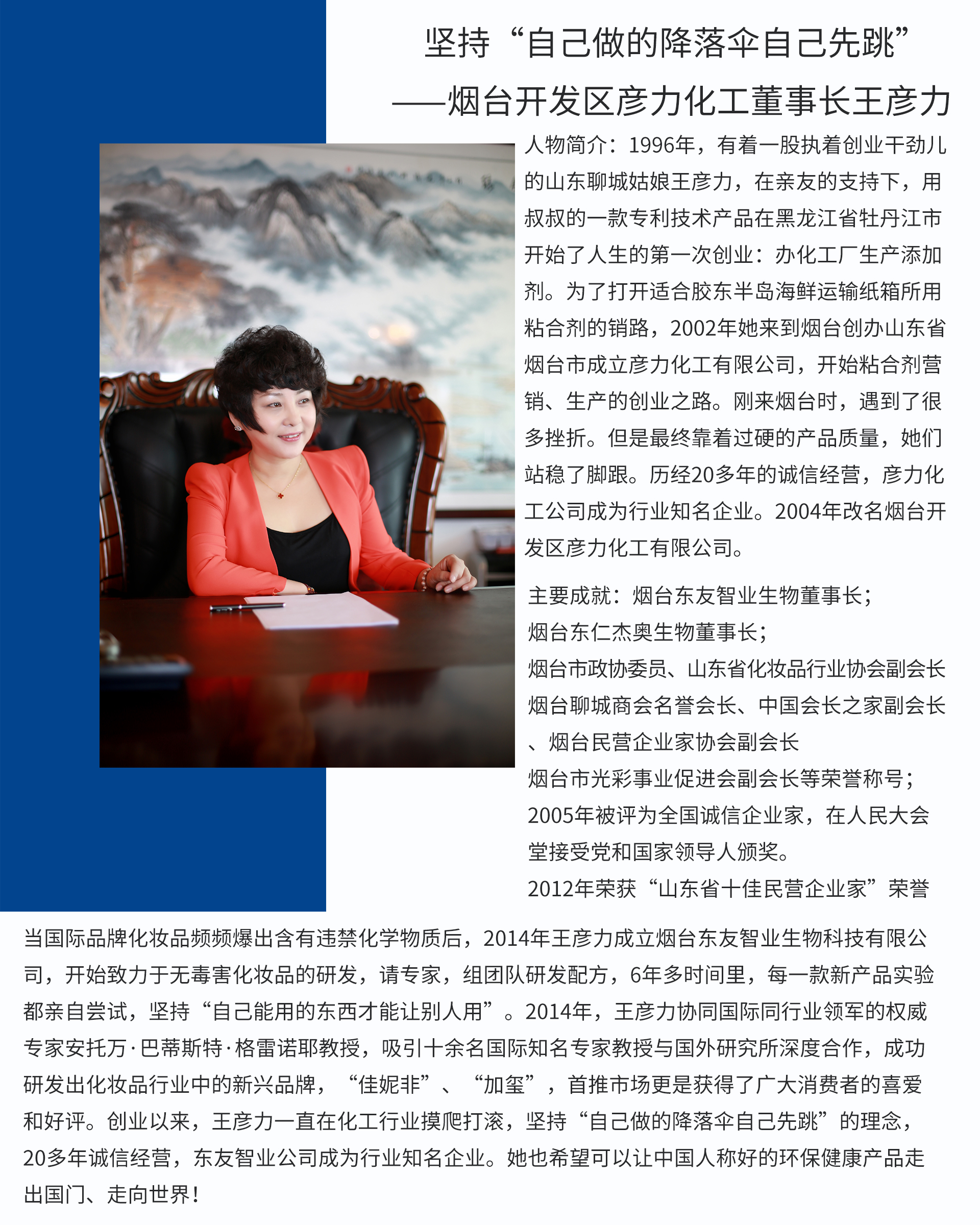烟台开发区彦力化工有限公司始建于1996年是我国很早就从事纸制品包装用粘合剂研制、推广的企业。公司注册资金1300万元,占地面积3万平方米,现有职工130多人。历经25载的磨砺与发展,目前已发展成为一家以化工为支柱产业,集洗化、日化、金融服务、房地产开发等多方位发展为一体的多元化企业。